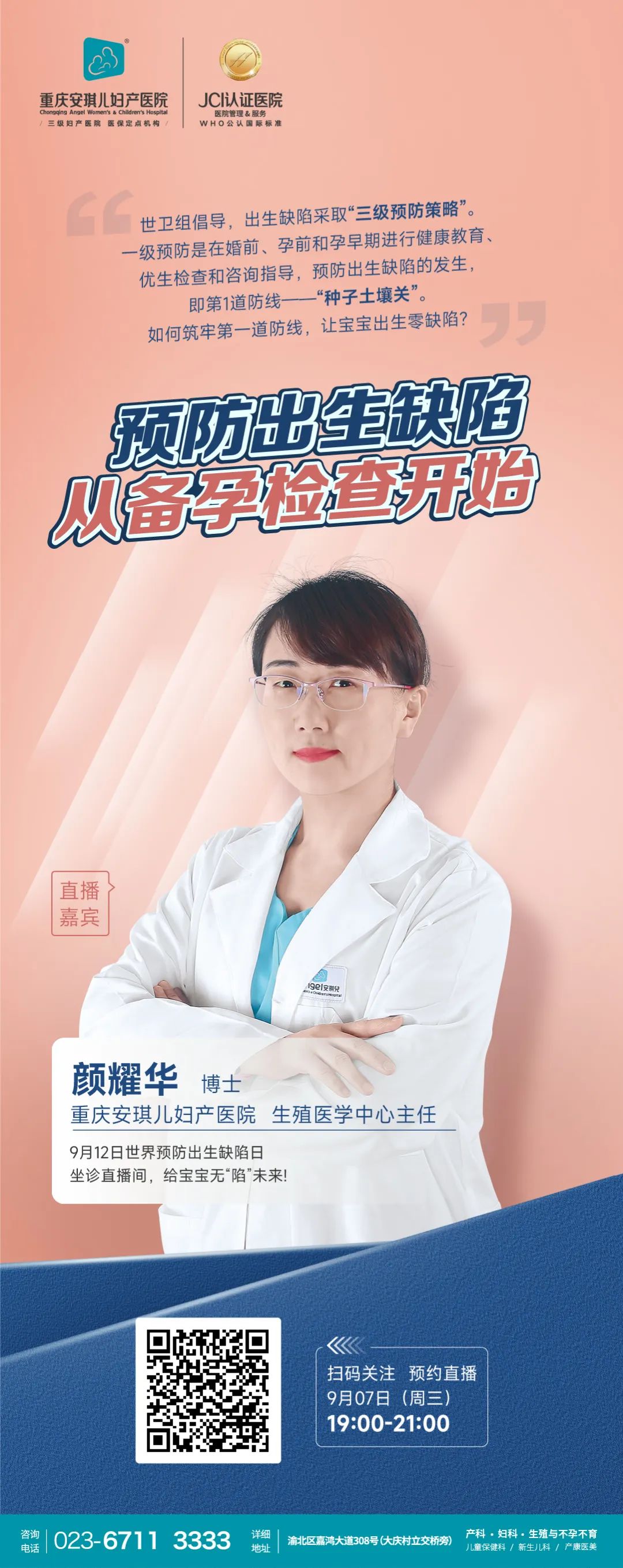主页 > 走进Angel > 医院新闻 > 预防出生缺陷 从备孕检查开始 2022-10-09 09:33 288 上一篇:胎宝偏小一周,我是不是该抓紧补起来 下一篇:女性雌激素不足老得快,补充雌激素很重要 相关阅读/reading 孕期遇上阴道炎,怎么预防远离TA 做好备孕检查 预防新生儿缺陷 女性健康100问丨孕产期如何预防盆底功能 好孕36计 | 孕期遇上阴道炎,怎么预防远 重庆安琪儿专家教你预防孕期过敏妙招 相关科室/The relevant departments 产科 月子 妇科 新生儿 儿保 生殖医学