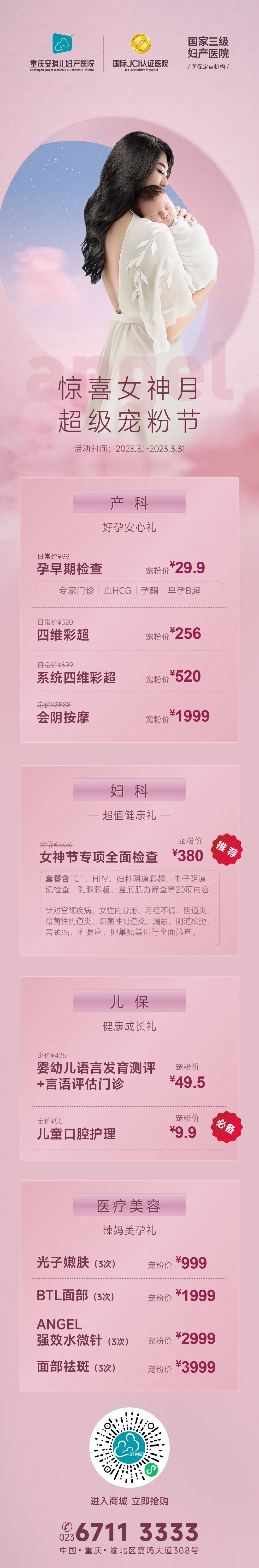 主页 > 走进Angel > 医院新闻 > 惊喜女神月 超级宠粉节 | 产科、妇科、儿保、医美给您全方位宠爱 2023-03-06 09:06 239 上一篇:HPV感染所致疾病怎么治?了解一下光动力治疗技术 下一篇:试管婴儿屡战屡败如何破解?3.12知名生殖专家联合公益问诊助你早日好孕 相关阅读/reading 产后第一次来月经需要注意什么? 在月子期间,喝哪些汤,有助于妈妈的身 胎儿每个月怕什么|孕妈一定要知道 月经提前卵巢早衰怎么治疗 爱心义诊丨“芳菲四月天 浓情健康月”安 相关科室/The relevant departments 产科 月子 妇科 新生儿 儿保 生殖医学